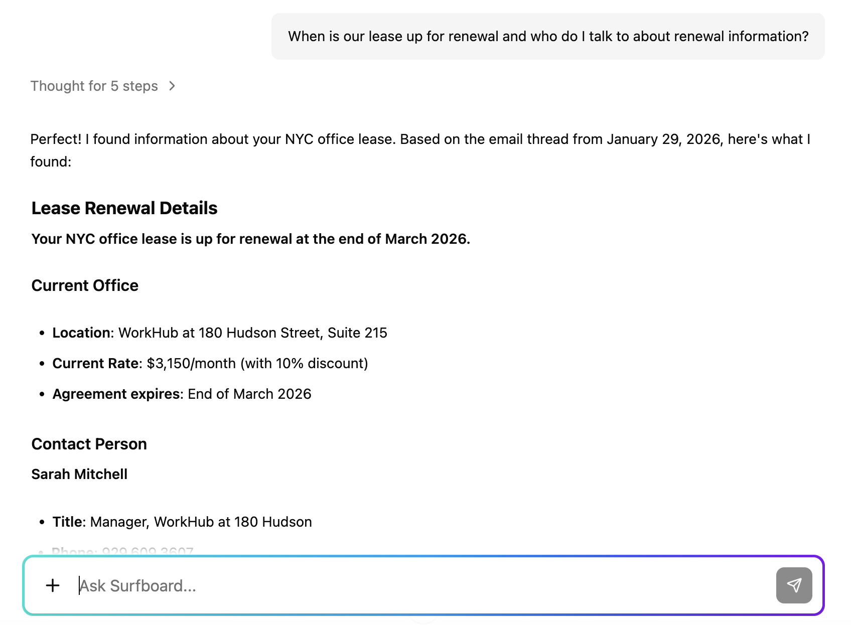 Stop digging through Slack, email, and Drive. Ask Surfboard a question and it searches everything—then shows you exactly what you need.